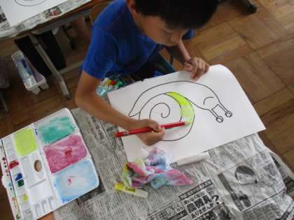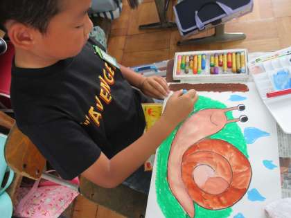 6月5日,図工の時間には絵の具を使い,グラデーションを作りました。自分の好きな色にだんだん白い絵の具を足していき,濃い色から淡い色のグラデーションを作りました。最後は,かたつむりのからを塗りました。
