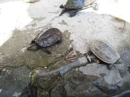 冬の間,どこかで冬眠していたのでしょうか。食べ物がなかったからか,少し小さくなっているようです。でも,戻ってきてうれしいのか,仲間のカメといっしょに水の中を泳いだり,エサを食べたり,とても元気にしています。おかえりなさい!