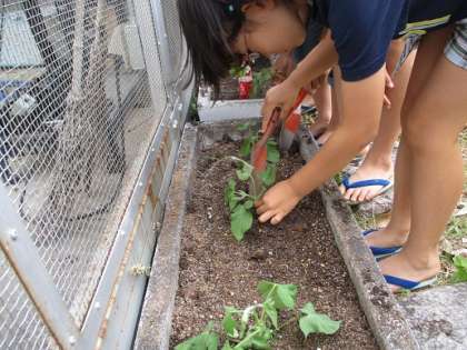 10日(月)の委員会活動で,アサガオ・ツルレイシ・風船カズラの苗を植えました。少しでもエコに貢献できるように,グリーンカーテンを作ります。