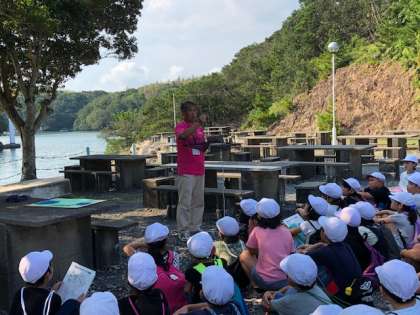 明日はかご漁をします。そのために,今日の時点で海にかごを投げ入れておきます。かごの中には餌が入っているので魚やヒトデなどが入ってくれるはず…です!「いっぱい捕まりますように!」と班ごとに祈って先生にかごを投げてもらいました。