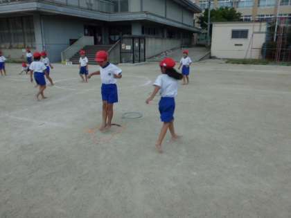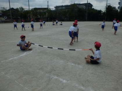 リズムよく跳んだり,高く跳んだり・・・。子どもたちにとってはなかなか難しいことが多いようです。友だちと競争しながら楽しく跳んでいました。