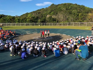 2日目が始まりました。6時に起き,眠い目をこすりながら朝の集いです。2日目の今日は,錦林小学校のお友達と合同で朝の集いを行いました。代表の人が,はだしであることや,1年生から英語があることを,一生懸命発表してくれました。それぞれの学校紹介をして,お互いどんな学校なのかを知ることができました。同じ館内にいるので,少しでも仲良くなれるといいなと思います。