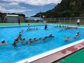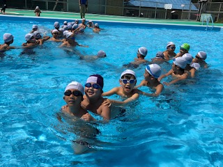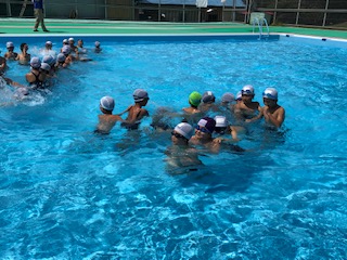 いつもの水泳学習とは違い,自由に友達と楽しく泳いでいます。みんなでつながって大蛇?電車?ごっこをして楽しそうです♪広いし深いしとっても気持ち良さそうです!先生たちは安全確認!しっかりみんなで見守っています!