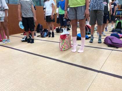 この写真は朝の集いです。無事にシーツ畳みをクリアして朝の集いを始めることができました。つま先立ちをしたり,今日のめあてを確認したりして,最終日の気合いを入れました。めあては「今までの行動を生かして楽しもう」です。これまでの2日間は注意の声が多かったので,最後は一人一人がメリハリをつけて楽しもうということでこのめあてになりました。