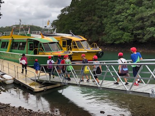 今日は雨のため船の上には上がれませんが,その代わりに1船の予定から2船に増やしてもらいました。綺麗なシートにゆったりと腰かけて移動できそうです。