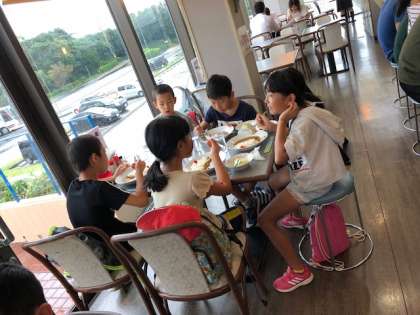 最後のごはんになりました。マリンランドのレストランでビーフカレーを食べます。おいしそうなにおいに,いただきますが待ち遠しそうでした。みんなもぐもぐ食べています。さあ,食べ終わったらいよいよあとは帰るだけです。