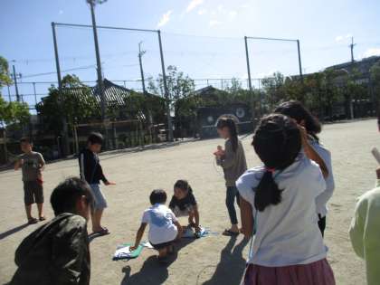 9日(水),理科「太陽の動きと地面の様子をしらべよう」の学習で,太陽の動きを観察しました。方位磁針と遮光板を使い,北と南の場所を確認したあと,太陽が出ている方角を調べました。「9時ごろには,投てき板の上あたりにあるよ。」「方角は,南東だね。」と,観察して気が付いたことを話し合っていました。