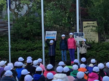 7時からは金閣小,福西小,羽束師小の人たちと一緒に,4校合同の「朝の集い」をしました。それぞれの学校が自分の学校の紹介をします。代表の児童が広沢小学校の紹介をしました。これまでの,そして昨夜の練習の成果を発揮し,堂々と発表することができました。