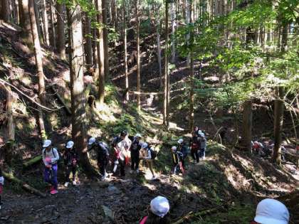 山登りでは,途中少しずつ休憩を入れながら進みます。倒木等で歩きにくい箇所もありますが,頑張って乗り越えます。