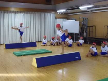 平均台の上を歩いたり,とんだり・・・。最後には,みんなで平均台の真ん中でポーズ!今日のポーズは,昨日よりもさらにレベルアップ!子どもたちから出た案は,なんと,Y字バランス!!グラグラふらふら。とっても難しかったようです。でも,バランスをとったり,柔軟性を活かしたり・・・。いろんな動きをするのが子どもたちは,楽しいようです。