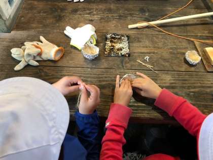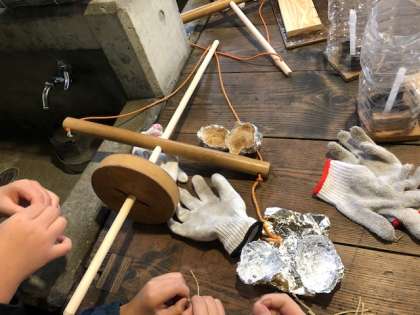 今日の最初の活動は「火起こし体験」です。写真のような道具を使って,火を起こします。うまく火が付きますように。