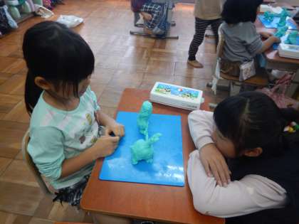 先日の遠足で見た動物を思い出しながら,「かっこいいトラを作ろう」「うさぎ,かわいかったなあ」とお話しながら作っていきました。