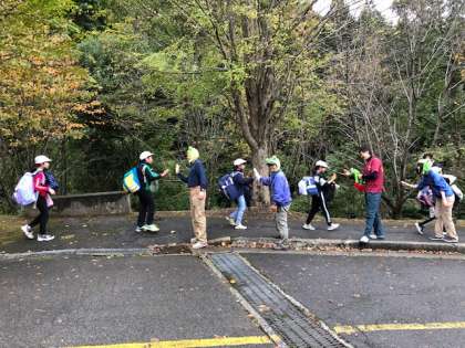 いよいよ4日間過ごした花背山の家ともお別れです。退所式の後,山の家の先生たちとハイタッチをしてさようなら。バスに乗り,広沢小学校へ戻ります。
