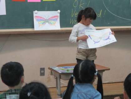 色の言い方を学習して,自分が選んだ色で,自分のオリジナルちょうちょを完成させ,今日はそれを紹介し合いました。