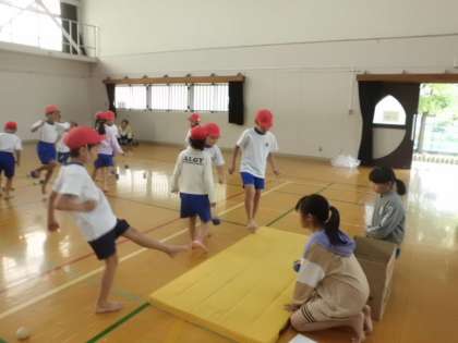 体育館にちらばいるいろいろな物を足指でつかみにいきました。「スタート!」の合図でお宝めがけて一目散の子どもたち。つかむのが難しいものもありましたが,一生懸命つかんでは,マットに置きを繰り返していました。