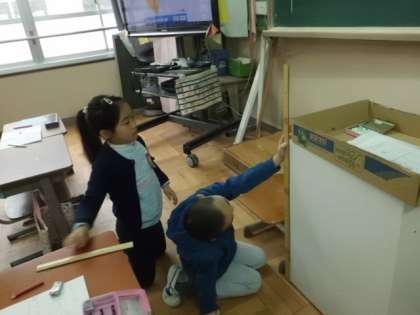 教室や廊下にあるいろいろなものの長さを1メートルものさしを使ってはかります。子どもたちは,長さを予想した後,実際に測定を行いました。「思ったより長かった!」「給食台と机2個分は,同じ長さやった!」など測ってみていろいろな感想をもったようです。