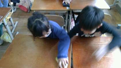 写真はキーワードゲームをしている様子です。アンディー先生がお題の単語を言ったら,消しゴムを取れます。アンディー先生の声にしっかりと耳を傾け…。必死なあまりこの速さ…たくさん練習をして,英語で言えるようになるといいですね!