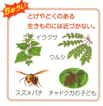 いきものたちが かっぱつに 動きはじめます。空をみると,ツバメが たくさん とんで いました。しぜんを 見るときには つぎの いきものたちには ちゅういしてくださいね。