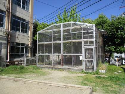ひんと(1) なかにわにある,しろい「こや」です。