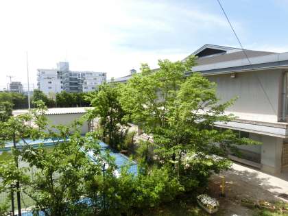 4年生の教室から外をながめると,さくらの木の葉がとてもきれいです。