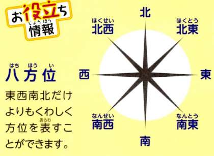 東西南北はわかったかな? 今,みんなが知ったのは 4つの方位ですね。方位はさらに こまかくわけることができますよ。さらに4つの方位をあわせて,8方位で地図をみてみよう