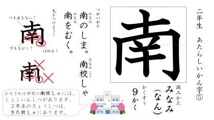 「南」は、よこかくのながさ,たてかくのはじまりに気をつけて書きましょう。