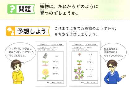 2年生のときにそだてた 植物を思い出しながら どのように そだつのか よそうしてみよう。アサガオがタネから芽(め)を出したあと 花がさくまではどのように そだっていたか,思いかえしてみてね。