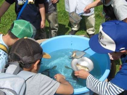 子ども達に大人気は、やはり生き物コーナー。どじょうすくい・ザリガニつり・ふなすくい。そしてちょうの館。