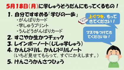 2年生は,18日(月)と25日(月)に,「学しゅうそうだん日」です。ひさしぶりにあえるので,先生はたのしみにしています。