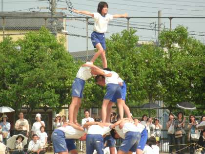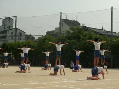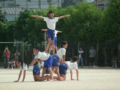 6年生にとっては小学校生活最後の運動会。これまでの練習の成果を発揮すべく、一人一人が全力で取り組みました。6年生の組体操のテーマは、協力・絆・団結です。運動会の最後を締めくくる6年生らしい演技をし、大きな拍手をいただきました。