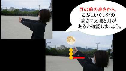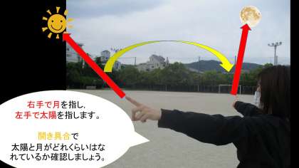 今日は学校でも6年生の先生にも月と太陽の位置を調べてもらいました!観察の期間は18日までなので,明日もまた観察してみてくださいね。