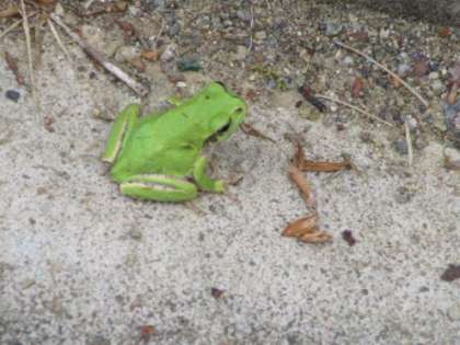 きれいな みどりいろの かえるです。 こちらに きづいて, ぴょんぴょん はねて かくれてしまいました。