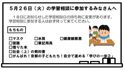 明日の持ち物で変更があります。下を確認して,持って来てください。明日元気に来てくれるのを楽しみに待っています!