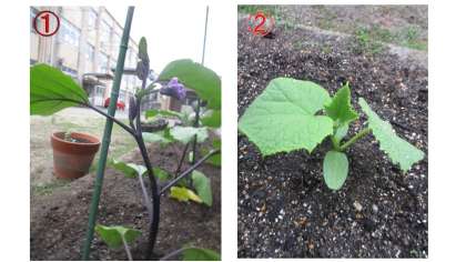 クイズです!!上の4まいのしゃしんは,それぞれキュウリ,オクラ,ナス,ピーマンのどのなえでしょう???かんがえてみましょう!!