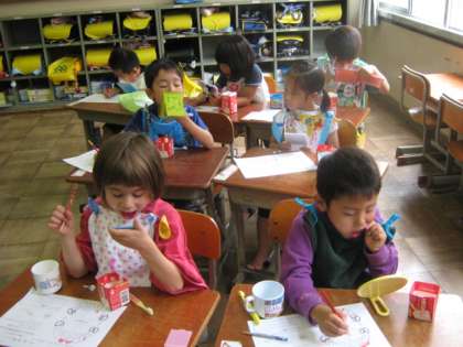 染まったところをプリントに色ぬりしていくと,あらあら・・・。歯の図が真っ赤になっていきます。「こんなに汚れているのか,大変だぁ!」とそのあと一生懸命に歯を磨きました。