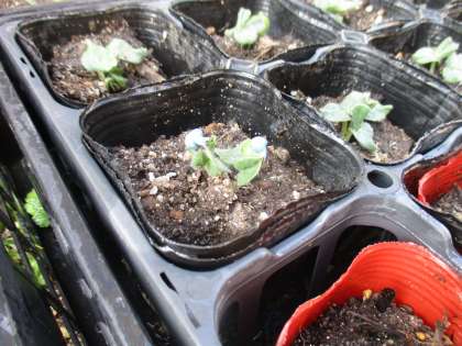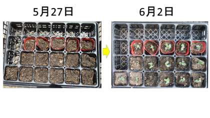 タネをまいたのは,5月27日です。1しゅうかんもたつとめがでるんですね!しゃしんでは見えにくいところもありますが,すべてのポットからめが出ています。また,ちかづいてよく見ると,色のついたタネのかけらもついていますね!