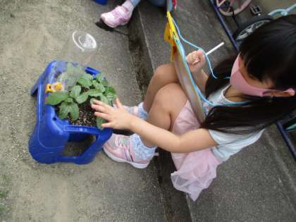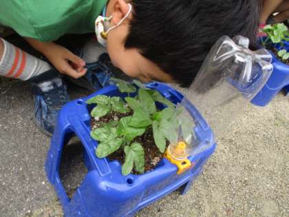 4日(木),生活科の時間にアサガオの観察をしました。「根っこのところが赤くなっているよ。」「ツルツルの葉っぱとザラザラの葉っぱがあるね。」「やわらかくて気持ちいいよ。」と,気づいたことや感じたことを話していました。