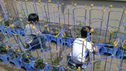 Bグループのが,ミニトマトに水やりをしている様子です。子供たちは,毎朝水やりを頑張っています。今日は,Bグループの人がAグループの人の水やりもしてくれました。 ミニトマトは,どんどん大きくなっています。赤い実になるのが楽しみです。