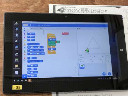 まずは正方形を作図するプログラミングをみんなで確認し,その後は正三角形や正五角形などを作図しました。