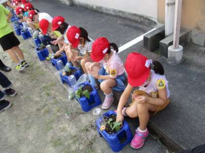 9日(火),生活科「さかせたいな,わたしのはな」の学習でまびきをしました。まびきをする時には,「土からえいようをいっぱいもらってね。」と話す子もいました。葉の数が日に日に増えており,子どもたちは成長を楽しみにしています。