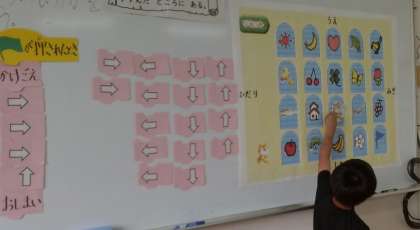 去年の教科書とは少し場面を変え,宝探しの場面。宝が隠されているところまで,行き方を考えて猫を動かそうという学習です。「上」「下」「右」「左」をうまく組み合わせて,自分の行きたいところへたどり着けるか?