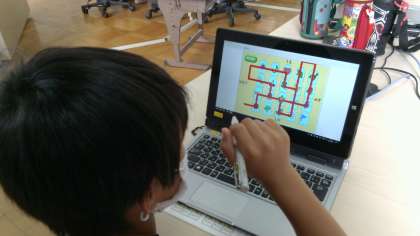 初めてのコンピュータに緊張気味だった2年生ですが,慣れてくればお手のもの!「じゃあ,今度は大回りして行ってみよう!」「すべてのドアを通ってみよう!」と考え方を働かせ,楽しそうに取り組んでいました。