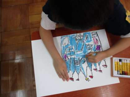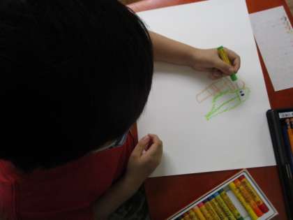 「インコを飼っているから,インコを描いたよ。」「チョコレートのケーキが好きだなあ。」「遊園地が好きです。」と,お話しながら楽しく絵を描いていました。