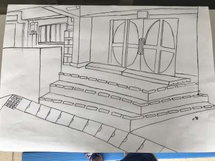 奥行が出るように見方を考えて,下描きをしました。また,割りばしペンを使って,線の濃さや太さを変える工夫もしました。