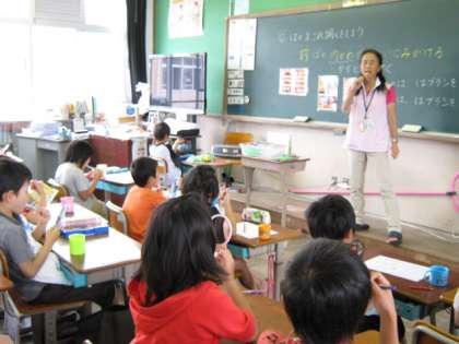 3年生の歯みがきの目標は「前歯の内側がきれいにみがける」です。歯ブラシのかかとを上手に使って、よごれをかき出すようにみがく練習をしました。歯垢染め出しでは、「前より赤くない。」「歯の内側が見えにくい。」と元気な声があがりました。