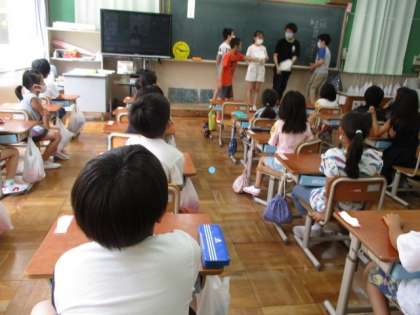 それぞれ別の場所に集まって集会をするので,1年生は登校班のお兄さんやお姉さんに迎えに来てもらって一緒に行きました。