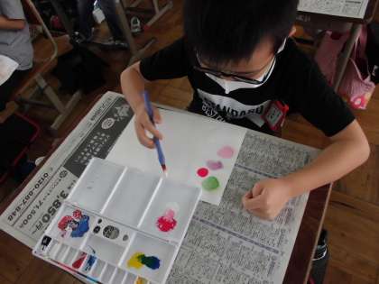 彩色にちょうどいいとは?「絵の具だけでは全く色がのびひん」「何か重い感じ」「水を足したら,めっちゃキレイ」と様々なつぶやきがありました。教室中が小さなアーティストであふれていました。