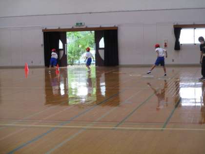 体育館に登場した「広沢ランド」を,ケンケン跳びや両足跳びをしながら順番に回っていきました。