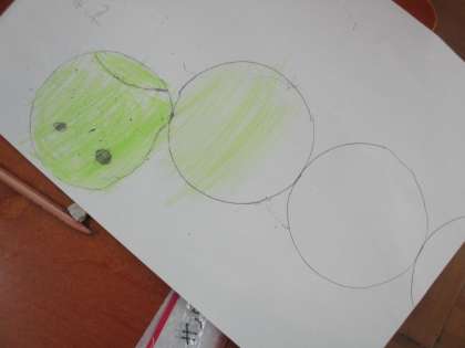丸の形はたこ焼きやリンゴに,四角の形は建物や乗り物になりました。下の写真のように,丸をいくつか並べてあおむしの絵にした子もいました。
