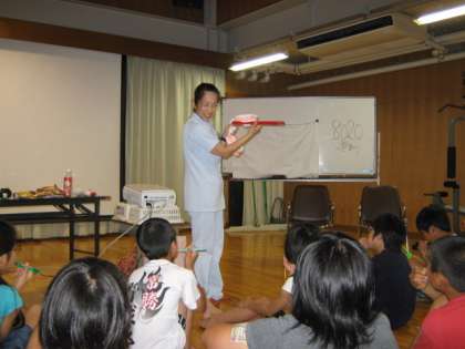 始めに歯周病の写真を見せてもらい、正しい歯みがきの仕方でみがくことが大切だということを教えてもらいました。それから、持ってきた歯ブラシチェックを行います。毛先が広がっていないか、大きさはどうか確認し、いよいよブラッシング練習の開始。シャカシャカと歯ブラシを細かく素早く動かして、隅々まできれいにみがくことができました。